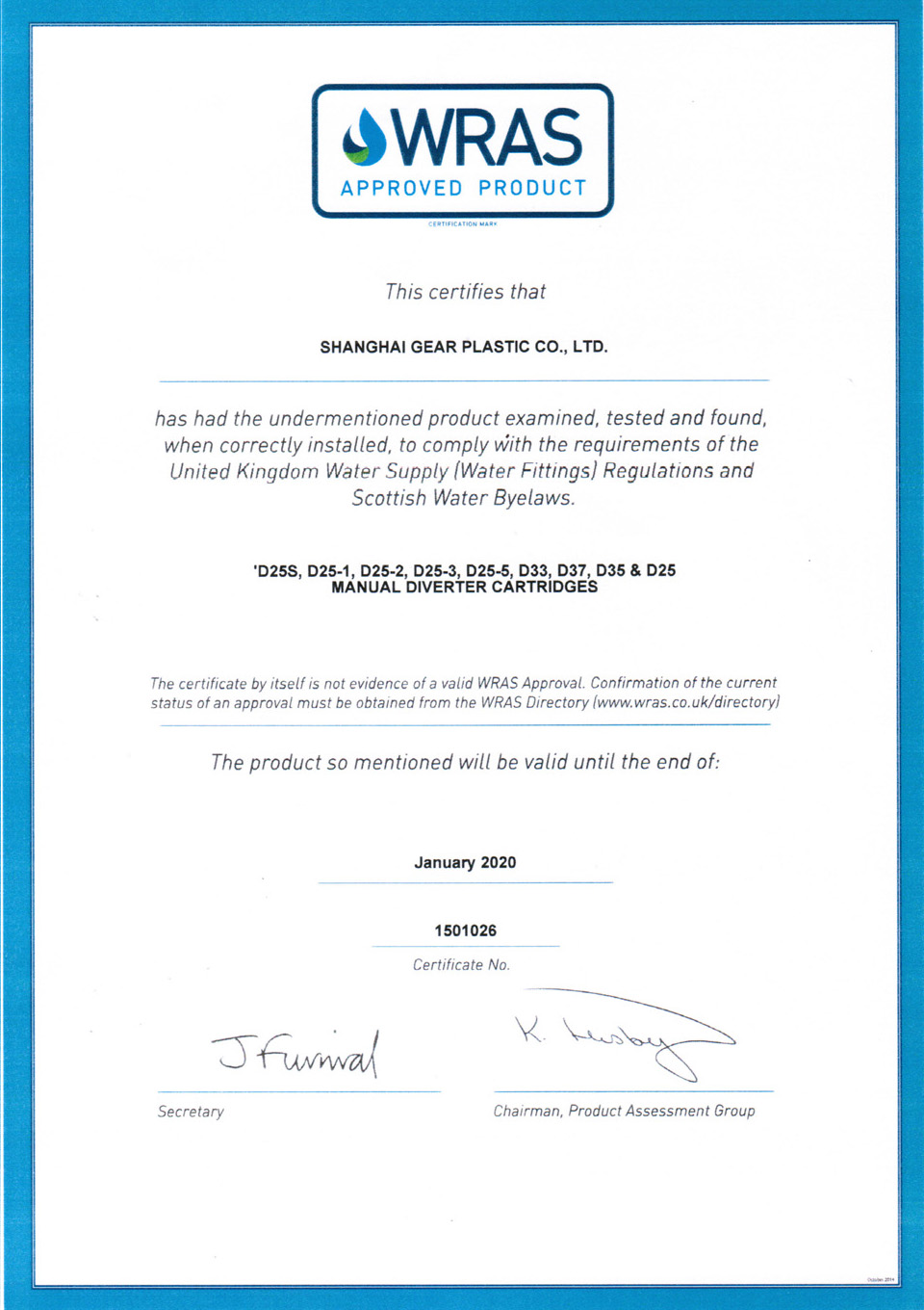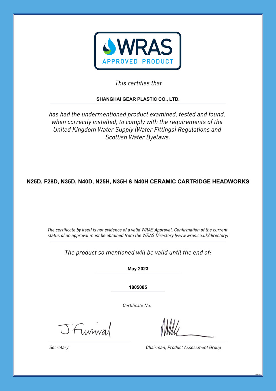 UK WRAS certificate